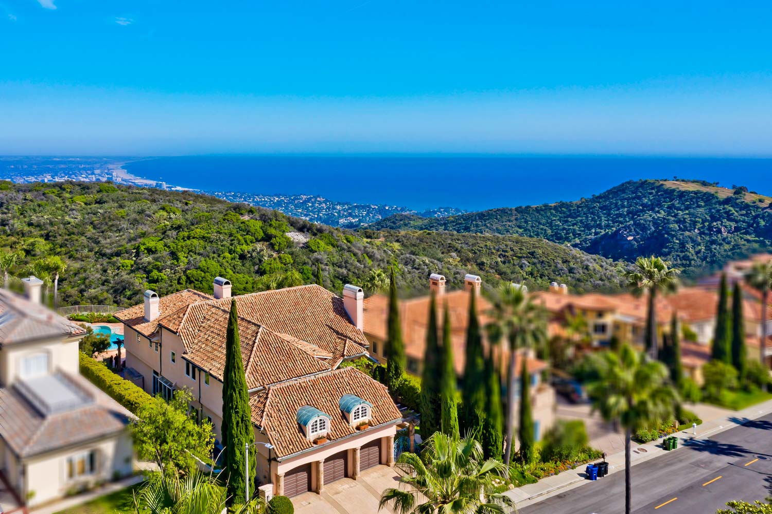 Classic elegance defines this gated property with big ocean & mtn views. The romantic courtyard approach brings you to beautiful iron & glass doors and an opulent entry once inside. Boasting formal liv & din rms, plus a bar area off the grand fam rm. Huge kitchen & brkfst rm that is wonderful for large-scale parties yet intimate for daily living. The main level is completed by one suite, a beautiful study with wood built-ins and ceiling, and powder/laundry rms. Ascend the sweeping curved staircase w/custom ironwork to the loft area on the upper level. Master suite w/frplc & exquisite ocean views + bath/dressing area w/2 commodes, 2 closets & more. The upper level also enjoys three additional suites plus a bonus room (ideal playroom, gym, office, etc). Step outside to experience the natural beauty & feeling of tranquility this yard offers (pvt pool/spa, large grass yard + patio spaces & views! Summit Club has pl, gym, tennis, basketball & playground. PDRA park also included in HOA dues.